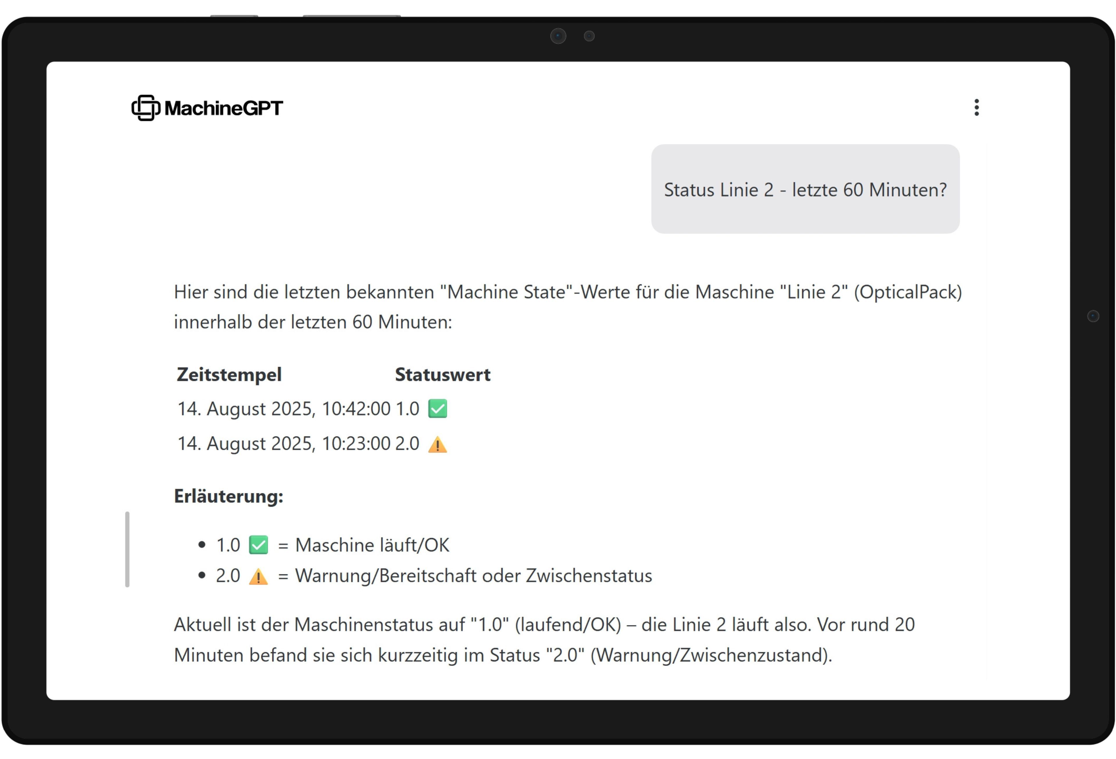 Nach Anbindung an die jeweilige Datenquelle beantwortet MachineGPT Fragen zu Zuständen und erzeugt einfache Statistiken direkt im Chat. Das reduziert Tool-Wechsel und macht Ad-hoc-Abfragen alltagstauglich.