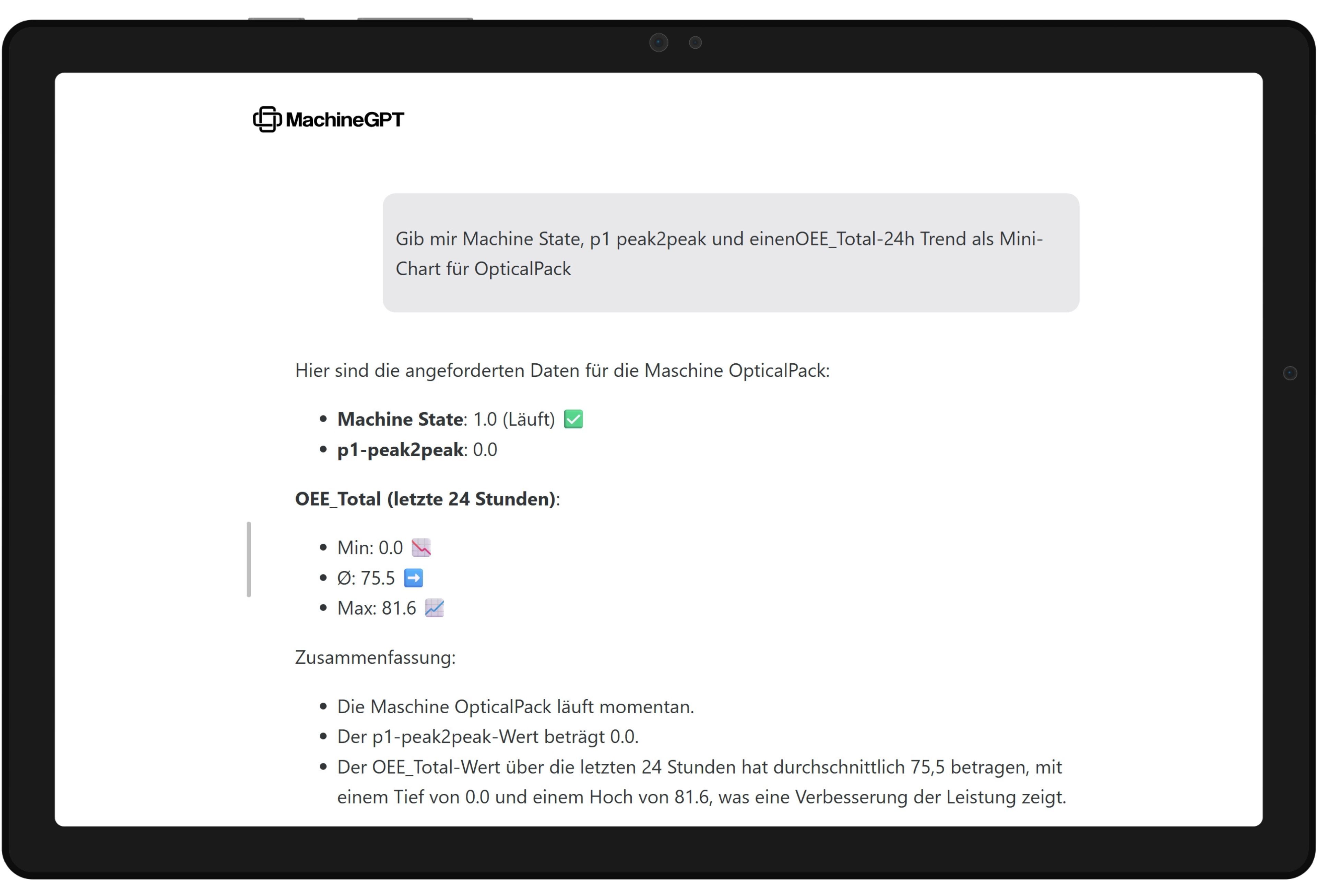 Im rechten Bild wird nach einer aktuellen Statistik der vergangenen 24 Stunden gefragt. In diesem Fall sind dies der Status der Maschine, eine Spitze-Spitze-Bewertung und der OEE-Total-Wert über die letzten 24 Stunden. Welche Werte verfügbar sind und wie aktuell sie sind, hängt von der angebundenen Datenquelle ab (z. B. Infrastruktur, Edge, Datenplattform, Cloud).
